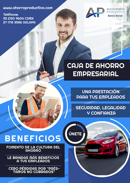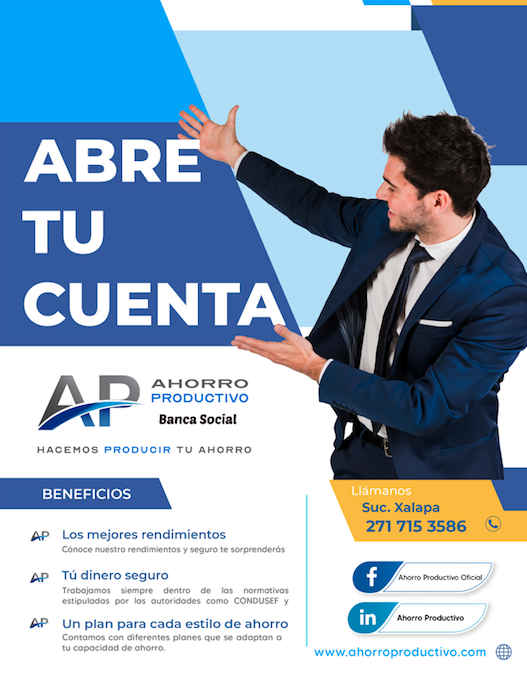 ¡SER SOCIO YA! Contamos con planes y beneficios para cada estilo de ahorro. Abre tu cuenta y sé parte de los que ya están ganando ¡Abrirla ya! Bríndale a tu personal prestaciones que te ayuden a hacer más. ¡Regístrate ya! Empezar ahora ¿QUIENES SOMOS? Ahorro Productivo es una sociedad cooperativa de ahorro, inversión y prestamos.Fundada el 9 de diciembre de 2015.Trabajamos con esfuerzo y profesionalismo para ofrecer productos financieros que ayuden a nuestros socios a que alcancen sus objetivos Con una gama amplia de opciones somos una alternativa sencilla de acceso al ahorro.Permitimos el ingreso de cualquier persona que guste ahorrar y obtener préstamos e inversiones. Trabajamos siempre dentro de las normativas estipuladas por las autoridades como CONDUSEF y CNBV MISIÓN Brindamos servicios financieros de ahorro y préstamo con honestidad y profesionalismo apoyando a la economía de nuestros cosios. VISIÓN La independencia financiera de nuestros socios. NUESTROS SOCIOS PERSONAS Porque todos somos diferente creamos productos para cada estilo para que ahorres e inviertas en lo que mas sueñas. EMPRESAS Contamos con productos financieros que se adaptan al perfil empresarial que nuestros socios necesitan para hacer crecer su empresa. NUESTROS PRODUCTOS AHORRO Contamos con una gama amplia de opciones para hacer que tu ahorro crezca. INVERSIÓN Nuestro portafolio de inversión es competitivo, con diferentes perfiles de productos, uno se ajustará a ti. PRÉSTAMOS ¿Necesitas dinero? con nosotros encontrarás la solución, no pienses más y afíliate. Sucursal Xalapa Tel. 27 1715 3586Camino a Bugambilias N.2 Loc. 9 Col. Jacarandas. C.P. 91637 Xalapa, Ver. contacto@ahorroproductivo.com Facebook-f Sucursal Ciudad de México Tel. 55 2120 9604Congreso de la unión N. 23 Col. Centro C.P. 15290 CDMX contacto@ahorroproductivo.com Facebook-f